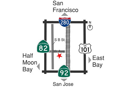 From north or south 280: Eastbound Hwy. 92 / take El Camino Real exit / left on El Camino Real / right on 9th Avenue / left on S B Street / right on 8th Avenue.